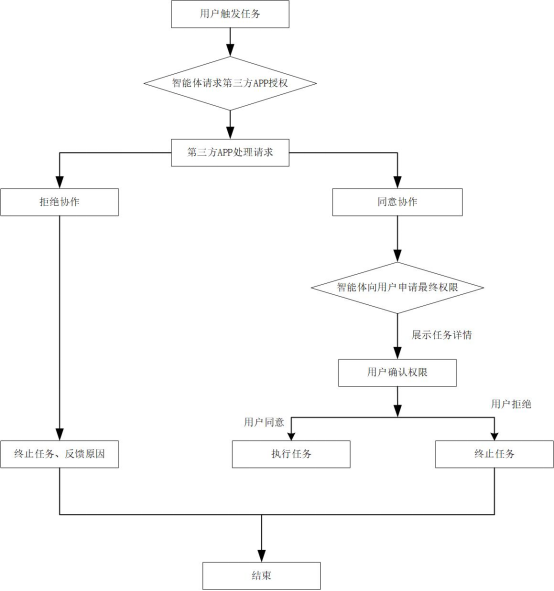 (2)双重授权原则:智能体在进行用户意图识别、通过第三方APP执行任务时,应先通过第三方APP授权,并在获得用户授权后执行。